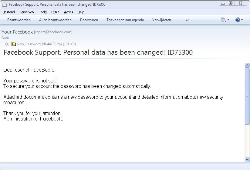Your password from Facebook appears to be unsafe and you need to verify attached document to view your new login information. There is a file attached called "New_Password_NU44133.zip"