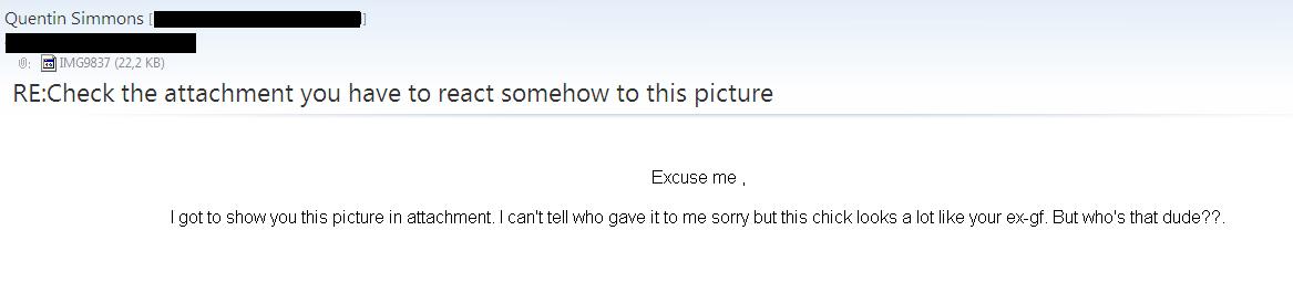 "Excuse me,I got to show you this picture in attachment. I can't tell who gave it to me sorry but this chick looks a lot like your ex-gf. But who's that dude??."