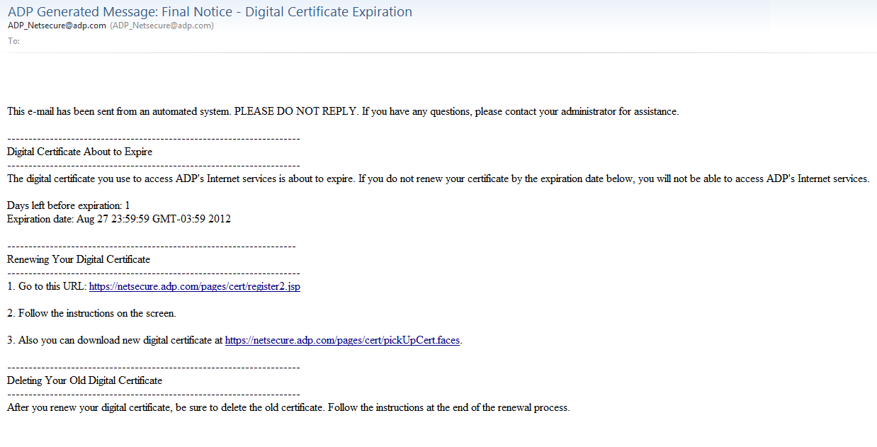 ADP Generated Message: Final Notice - Digital Certificate Expiration
