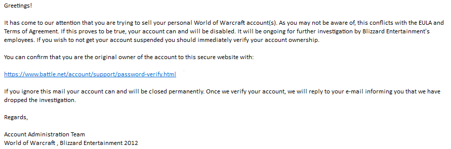 Greetings! It has come to our attention that you are trying to sell your personal Diablo III account(s). As you may not be aware of, this conflicts with the EULA and Terms of Agreement. If this proves to be true, your account can and will be disabled. It will be ongoing for further investigation by Blizzard Entertainment's employees. If you wish to not get your account suspended you should immediately verify your account ownership.