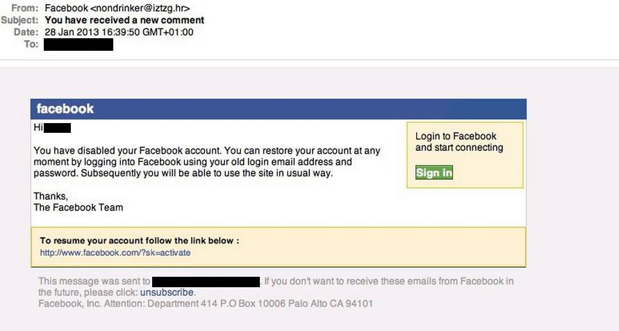 - The 'From' field says it's from "Facebook", however, the sender is clearly 'nondrinker@iztzg.hr'.