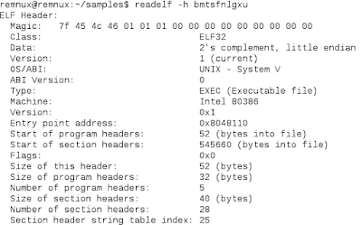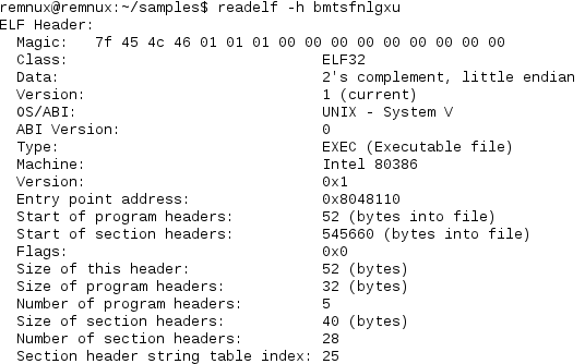 Moving on, we will start by using readelf for some further investigation of the file. We know, thanks to the file command, it's an ELF 32-bit executable for i386. Using readelf and parameter -h we will be able to gather more information: