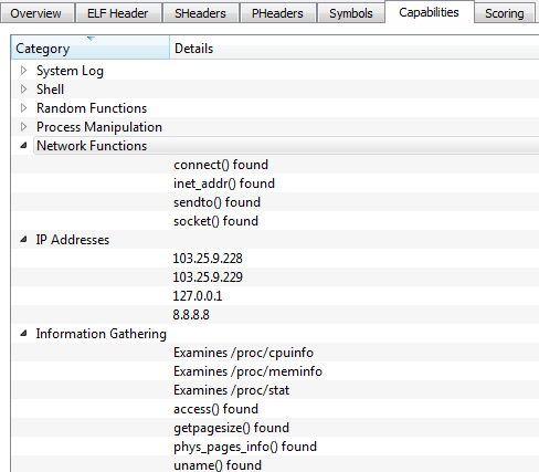 Using ELFparser you can also look at the ELF header, sections, but also all of its capabilities like Information Gathering and Network Functions for example. It's a handy second-opinion tool.