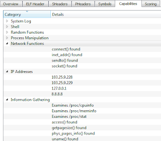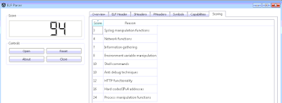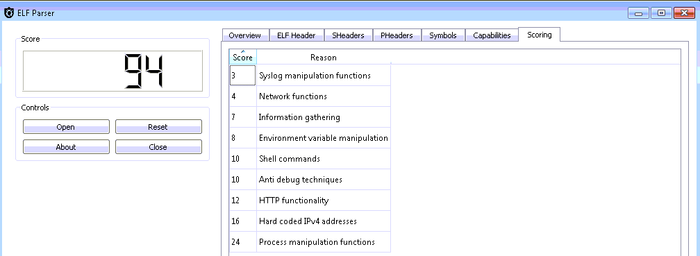 If you like GUIs, then I have another useful utility: ELFparser. It will perform a scoring based on several factors, such as shell commands, HTTP functionality and process manipulation. For example, for our file: