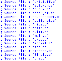 Why is that last part important? strip allows you to remove symbols and sections from choosen files, which in turn makes it harder to reverse engineer (disassemble) as well. In this case, the file doesn't seem to be stripped, great! For example, we can see the source files and get an idea of what this malware does: