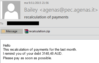 The ZIP file contains 2 files: recalculation_77979.pdf.js & info_9455.txt. The TXT file just contains the name of the first file, which tries to hide as a PDF file but is in fact JavaScript (JS).