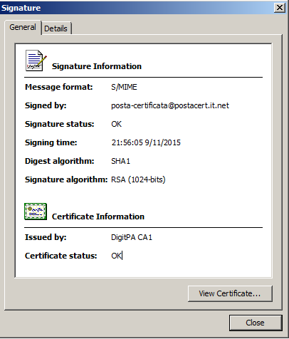| Signature details. S/MIME message format |