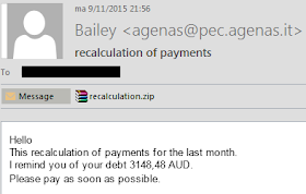The ZIP file contains 2 files: recalculation_77979.pdf.js & info_9455.txt. The TXT file just contains the name of the first file, which tries to hide as a PDF file but is in fact JavaScript (JS).