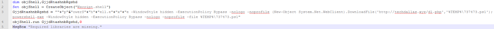 The VBscript uses Powershell with certain flags or parameters to download a file to the %TEMP% folder and execute it:
