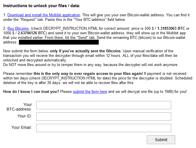 After encrypting all your files, it will drop an HTML file (named DECRYPT_INSTRUCTION.html) on the root of all your folders which contains the following message: