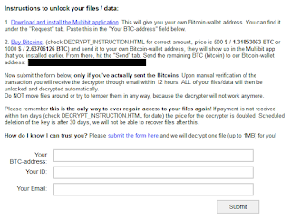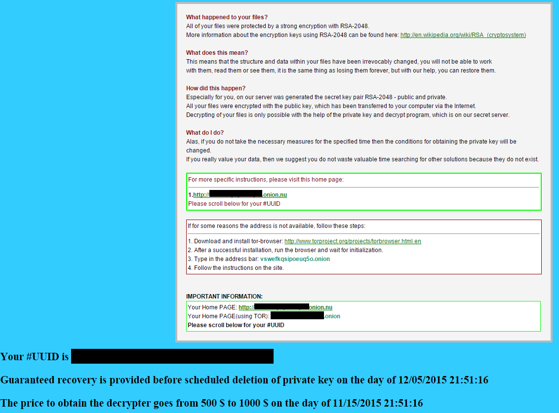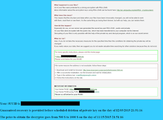 Difference here from the version of October is that they also offer to decrypt 1 file, as proof they can actually decrypt all your files again. Unfortunately, the encryption fails horribly (for example, no extension is appended) and your files will be unrecoverable. For more information, see here.
