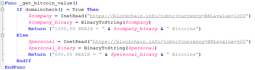 Interestingly enough, the ransomware has a built-in function to detect whether or not your machine belongs to a domain, and if so, will increase the amount of ransom to be paid to a whopping 1000 REAIS, or 0.25 BTC. (293 EUR | 259 GBP | 333 USD)