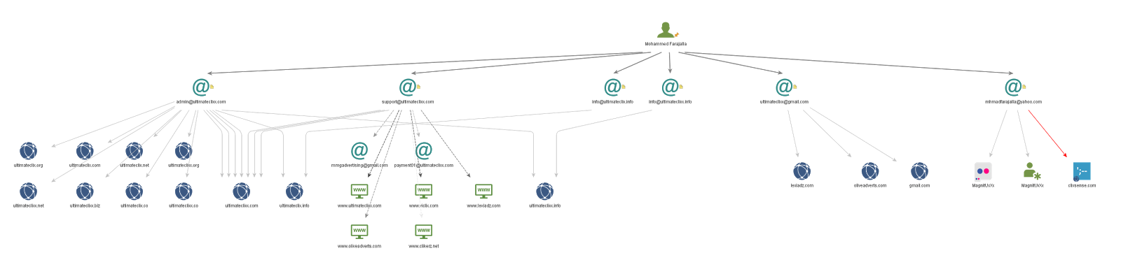 Passive DNS data reveals that the email address mentioned above, has links to other domains, and in particular to a person or persona called 'Mohammed Farajalla'. This persona has multiple email addresses set up, all pointing to click networks:
