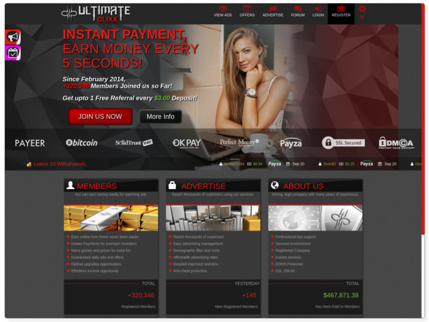 Ultimateclixx sports a flashing website, promising instant payment: