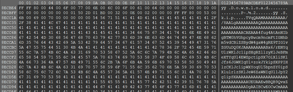 The newly download file is seemingly the legitimate CrunchyViewer or Crunchyroll, but, near the end of the file, there is a chunk of Base64 encoded data appended, as seen in Figure 4: